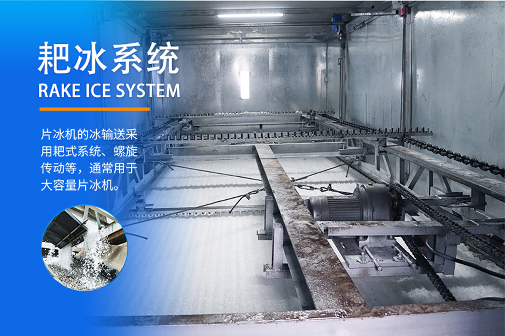 30噸24小時片冰機廣泛應(yīng)用于海港魚類冷卻、混凝土加冰降溫等。片冰機采用立式螺旋切冰蒸發(fā)器。制冰時水要均勻,通過分水裝置分布到冰桶內(nèi)壁。該系統(tǒng)由集裝箱式片冰機、帶耙系統(tǒng)的冷庫組成。