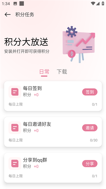 2、積分兌換回饋活動中便可以通過進行各種任務來進行積分的領到,有日常每日任務也是有下載任務。